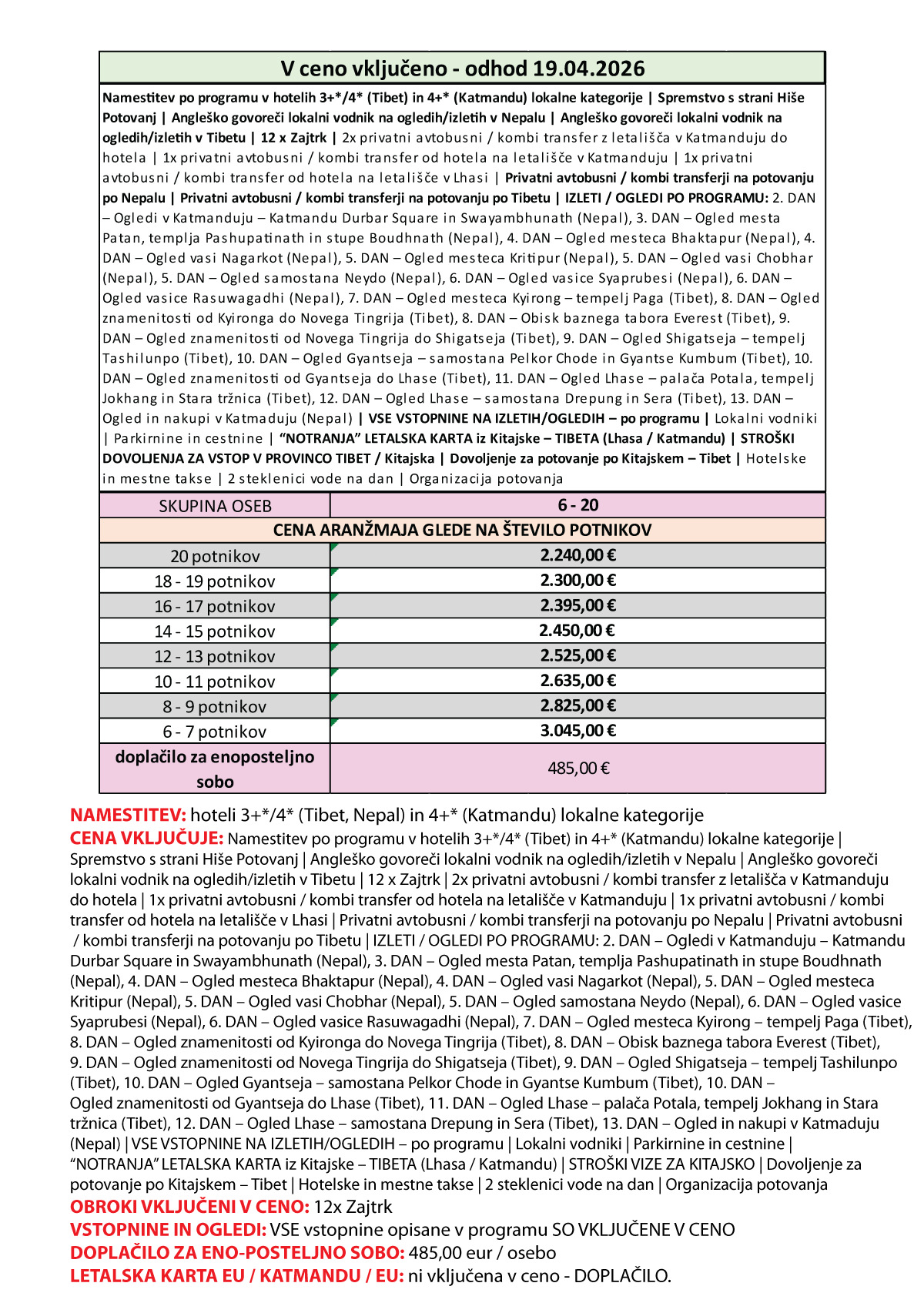 COVID-19 opombe: Zaenkrat za potovanje v Nepal in na Kitajsko ni omejitve ali posebnih navodil. Organizator potovanja si v primeru naknadnih omejitev pridržuje pravico do odpovedi potovanja ali prestavitev na drug datum oz. lahko od potnikov zahteva potrdila, ki bi bila priporočena ali zahtevana s strani slovenskih in/ali neplaskih in kitajskih državnih organov ( strošek morebitnih dodatnih potrdil ali testiranja je na strani potnika). V primeru kakršnih koli dodatnih stroškov zaradi morebitne kakršne koli restrikcije potovanja v Nepal in/ali na Kitajsko, si organizator potovanja pridržuje pravico do povišanja cene. Priporočamo, da redno spremljate našo spletno stran in navodila slovenskih, nepalskih in kitajskih državnih organov.